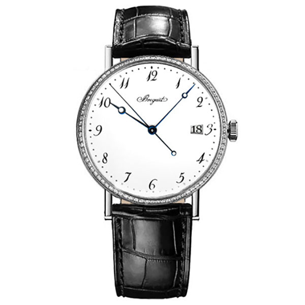 Breguet Classique Automatic White Dial Leather Mens Watch 5178BB/29/9V6.D000. 18Kt white gold case with a black leather strap. Fixed white gold set with diamond bezel. White dial with blue hands and Arabic numeral hour markers. Minute markers around the outer rim. Automatic movement. Scratch resistant sapphire crystal. Transparent case back. Case diameter: 38 mm. Case thickness: 8.25 mm. Round case shape. Tang clasp. Water resistant at 30 meters / 100 feet. Functions: date, hour, minute, second.
