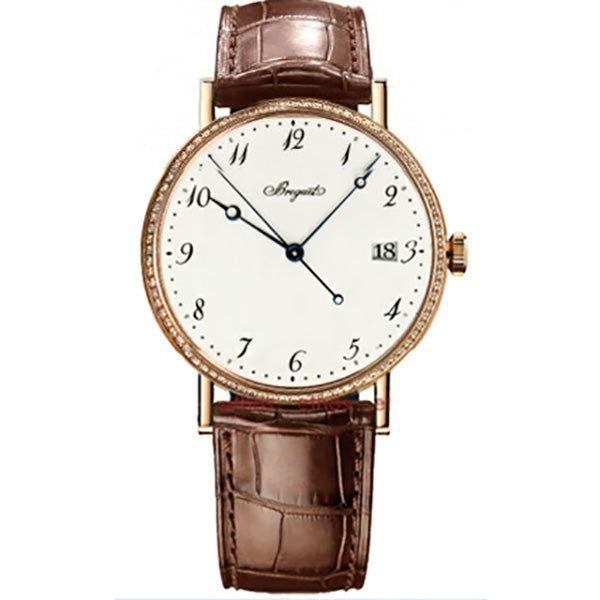 Breguet Classique White Dial Brown Leather Men's Watch 5178BR/29/9V6-D000. 18kt rose gold case with a brown ( alligator) leather strap. Fixed 18kt rose gold bezel set with diamonds. White enamel dial with blue hands and Arabic numeral hour markers. Minute markers around the outer rim. Automatic movement with a 55 hour power reserve. Scratch resistant mineral crystal. Pull / push crown. Skeleton case back. Case diameter: 38mm. Case thickness: 8.25 mm. Round case shape. Tang clasp. Water resistant at 30 meters / 100 feet.