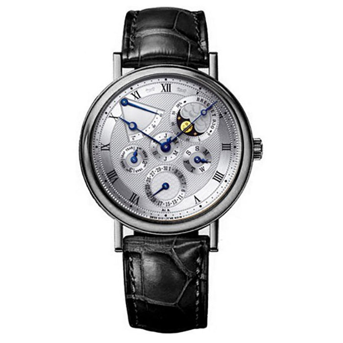 Breguet Classique Perpetual Calendar Silver Dial 18kt White Gold Black Leather Mens Watch 5327BB1E9V6. 18kt white gold case with a black leather strap. Fixed bezel. Silver dial with blue-toned hands and Roman numeral hour markers. Minute markers around the outer rim. Perpetual calendar. Six - power reserve indicator, moonphase, leap year indicator, month, day of the week and date. Automatic movement. Scratch resistant sapphire crystal. Pull / push crown. Case diameter: 39 mm. Case thickness: 9.5 mm. Round case shape. Deployment clasp. Water resistant at 30 meters / 100 feet.