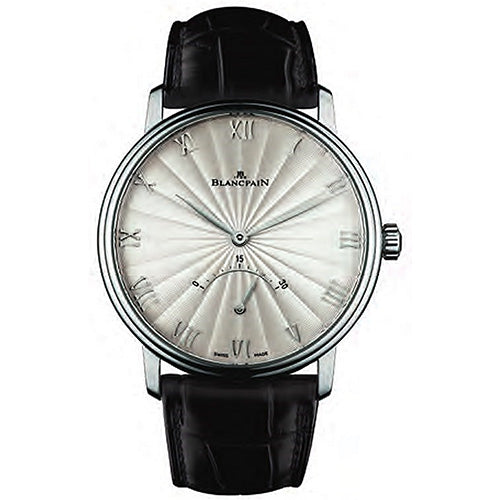 Blancpain Villeret Automatic Men's Watch 6653-1542-55B. 18kt white gold case with a black alligator leather strap. Fixed bezel. Flinque opaline dial with silver-tone hands and Roman numeral hour markers. Blancpain Calibre 7663 automatic movement. Scratch resistant sapphire crystal. Case size: 40 mm. Case thickness: 10.68 mm. Round case shape. Band width: 22 mm. Water resistant at 30 meters / 100 feet. Functions: hour, minute, second. Luxury watch.