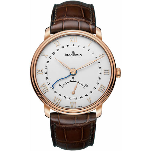 Blancpain Villeret Ultra Slim Date 30 Seconds Retrograde Opaline Dial Mens Watch 6653Q-3642-55B. 18kt rose gold case with a alligator brown leather strap. Opaline dial with gold-tone hands and Roman numeral hour markers. Automatic movement. Scratch resistant sapphire crystal. Pull / push crown. Transparent exhibition see through case back. Case diameter: 40 mm. Case thickness: 10.83 mm. Round case shape. Deployment clasp. Water resistant at 30 meters / 100 feet. Luxury watch.