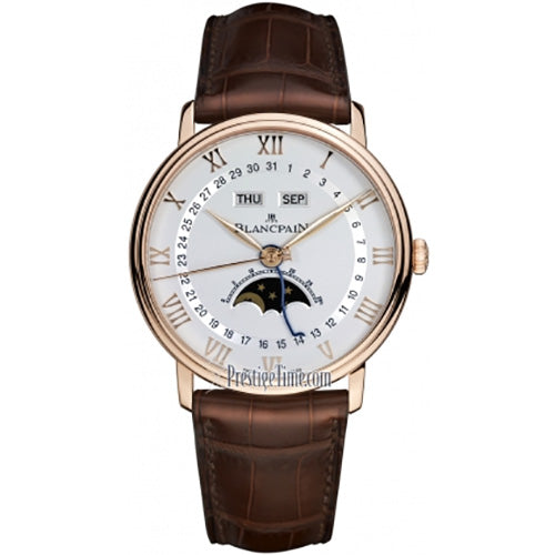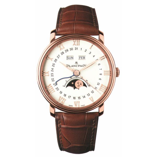 Blancpain 6654-3642-55 Villeret Moonphase & Calendar Mens Watch. Polished 18kt rose gold case. Flat silvered 'Opaline' dial. Stylized applied rose gold Roman Numeral hour markers. Elegant rose gold leaf shaped skeletonized hour & minute hands. Large central seconds hand in rose gold. Unlike most full calendar watches which have recessed pushers in the case edge & which require a tool to adjust the calendar features, this watch has the corrector buttons hidden beneath the lugs on the case back of the watch. This allows for a clean/uninterrupted look of the case edge & also the buttons can be activated with ones fingernails. 6654364255