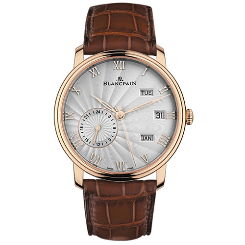 Blancpain Villeret Silver Dial 18kt Rose Gold Brown Leather Mens Watch 6670-3642-55B. 18kt rose gold case with a brown alligator leather strap. Fixed bezel. Silver dial with gold-toned hands and Roman numeral hour markers. 24 hour sub-dial. Automatic movement. Scratch resistant sapphire crystal. Pull / push crown. Case diameter: 40 mm. Case thickness: 10.90 mm. Round case shape. Deployant clasp. Water resistant at 30 meters / 100 feet. Functions: GMT, second time zone, hour, minute, second, calendar. Luxury watch.