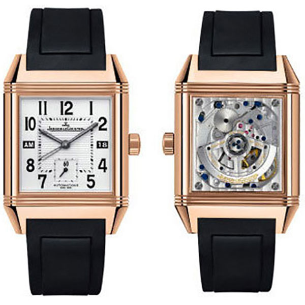 Jaeger-LeCoultre Q7002620 Reverso Squadra Hometime Watch. 18kt pink gold case, silvered guilloché dial with black transferred numerals, automatic calibre 977 movement with second time-zone, date, am/pm indication, approximately 45 hours of power reserve, rubber strap with double folding buckle. Water resistant to 50 meters.