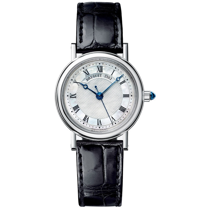 Breguet Classique Mother of Pearl Dial 18kt White Gold Black Leather Ladies Watch 8067BB52964. 18kt white gold case with a black leather strap. Fixed 18kt white gold bezel. Mother of pearl dial with blue breguet hands and Roman numeral hour markers. Minute markers around the outer rim. Automatic movement. Scratch resistant sapphire crystal. Pull / push crown. Transparent case back. Case diameter: 30 mm. Case thickness: 7.85 mm. Round case shape. Tang clasp. Water resistant at 30 meters / 100 feet.