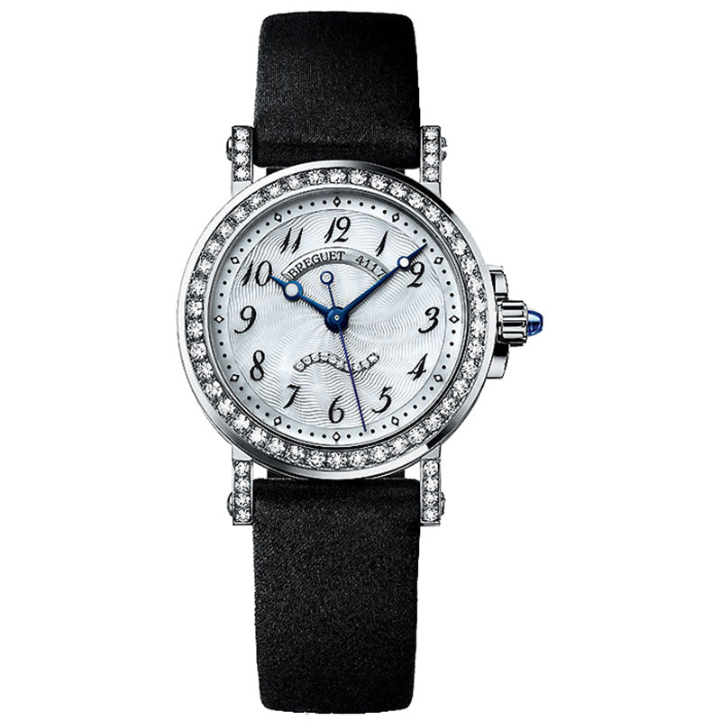 Case & Lugs set with 58 Top Wesselton VS quality round diamonds, weighing at aprox. 1.25 cts. Black Satin Strap with Large 18kt White Gold Tang Type (regular pin & loop) Buckle & Strap Loops pave set with 273 diamonds weighing aprox. 1.00 carats. Beautiful Mother of Pearl Dial Guilloche textured set with 10 diamonds in a wave shape. Painted Florale Design Arabic Numeral hour Markers. Blued "Breguet" Style Hands. Aprox. 40 Hour Power Reserve.