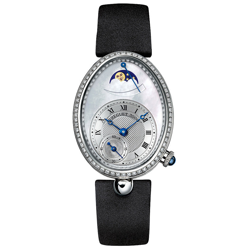 Breguet Reine De Naples Mother of Pearl Dial 18kt White Gold Diamond Black Satin Ladies Watch 8908BB52864D00D. 18kt white gold case with a black satin strap. Fixed 18kt white gold bezel set with diamonds. Mother of pearl dial with blue hands and Roman numeral hour markers. Minute markers around the outer rim. Automatic movement with a 40 hour power reserve. Scratch resistant sapphire crystal. Pull / push crown. Transparent case back. Case dimensions: 28.45 mm x 36.5 mm. Case thickness: 10.05 mm. Oval case shape. Band width: 17.8 mm. Band length: 7 inches. Deployant clasp. Water resistant at 30 meters / 100 feet. Functions: hour, minute, second, moonphase, 40 hour power reserve. Luxury watch.