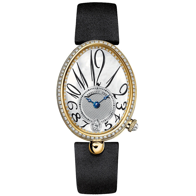 Breguet Reine de Naples Mother of Pearl 18kt Yellow Gold Black Satin Diamond Ladies Watch 8918BA58864D00D. 18kt yellow gold case with a black satin bracelet. Fixed bezel set with diamonds bezel. Mother of pearl dial with blue-toned hands and Arabic hour markers. Automatic movement. Caliber 537/1 engine with about 40 Hours power reserve. Scratch resistant sapphire crystal. Pull / push crown. Case diameter: 28.45 mm x 36.5 mm. Case thickness: 10.05 mm. Oval case shape. Deployant clasp. Water resistant at 30 meters / 100 feet. Functions: hour, minute. Additional Info: bezel set with 117 diamonds. Luxury watch style. Item Variations: 8918BA/58/864 D00D, 8918BA/58/864-D00D, 8918BA/58/864/D00D, 8918BA/58/864D00D.