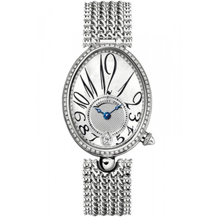 Breguet Reine de Naples Mother of Pearl 18kt White Gold Diamond Ladies Watch 8918BB58J20D000. 18kt white gold case with a 18kt white gold bracelet. Fixed bezel set with diamonds bezel. Mother of pearl dial with blue-toned hands and Arabic hour markers. Automatic movement. Caliber 537/1 engine. Scratch resistant sapphire crystal. Pull / push crown. Case diameter: 28.45 mm x 36.5 mm. Case thickness: 10.05 mm. Oval case shape. Deployant clasp. Water resistant at 30 meters / 100 feet. Functions: hour, minute. Additional Info: bezel and dial flange set with 117 diamonds weighing approx. 0.99 ct. Luxury watch. Item Variations: 8918BB/58/J20 D000, 8918BB/58/J20-D000, 8918BB/58/J20/D000, 8918BB/58/J20D000.
