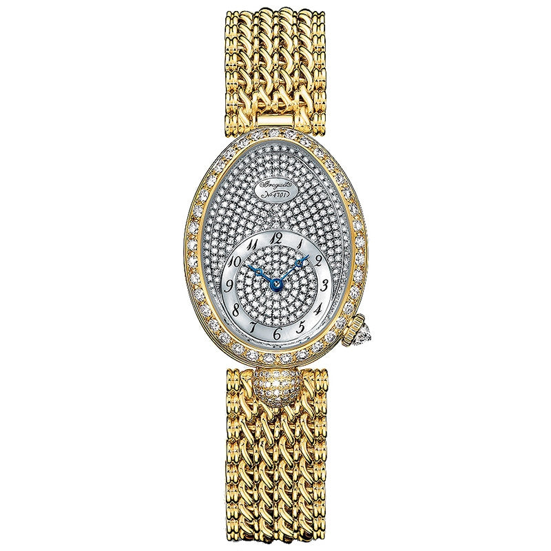 Breguet Reine de Naples Diamond Dial 18kt Yellow Gold Ladies Watch 8928BA8DJ20DD00. 18kt yellow gold case with a 18kt yellow gold bracelet. Fixed bezel set with diamonds bezel. Diamond pave dial with blue-toned hands and Arabic hour markers. Automatic movement. Caliber 586 engine. Scratch resistant sapphire crystal. Pull / push crown. Transparent (see-through) case back. Case diameter: 24.95 mm x 33 mm. Case thickness: 8.60 mm. Oval case shape. Deployant clasp. Water resistant at 30 meters / 100 feet. Functions: hour, minute. Additional Info: bezel, dial flange and lug set with 139 diamonds totaling approx. 1.32 cts. Luxury watch style. Item Variations: 8928BA/8D/J20 DD00, 8928BA/8D/J20-DD00, 8928BA/8D/J20/DD00, 8928BA/8D/J20DD00.