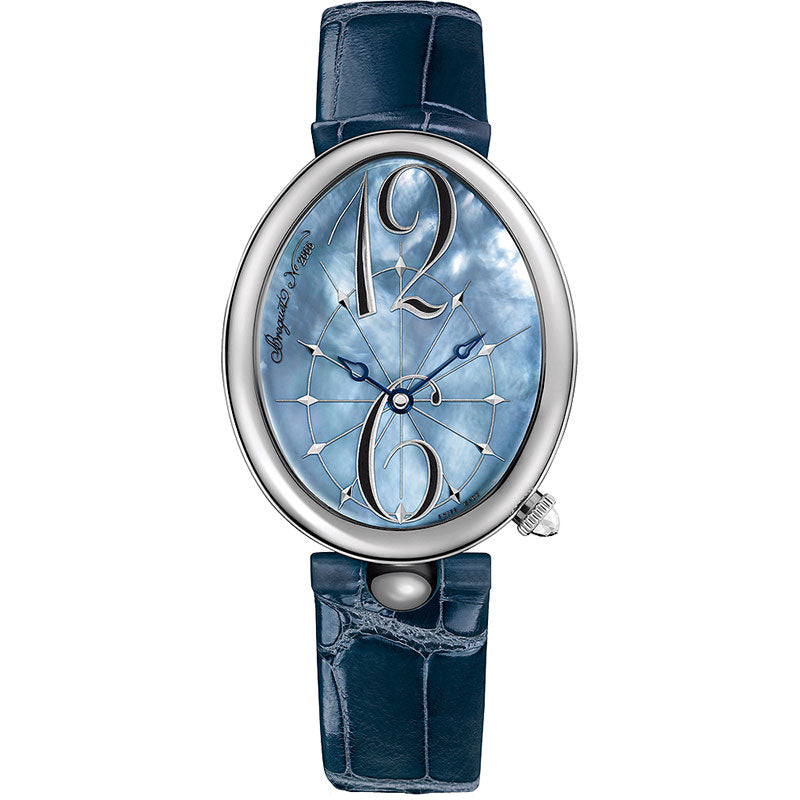 Breguet Reine de Naples Blue Mother of Pearl Dial Leather Ladies Watch 8967ST/V8/986. Stainless steel case with a blue alligator leather strap. Fixed bezel. Blue mother of pearl dial with blue hands and stick hour markers. Arabic numerals mark the 6 and 12 o'clock positions. Automatic movement with 38 hour power reserve. Scratch resistant sapphire crystal. Skeleton case back. Case diameter: 35.5 x 43.75mm. Case thickness: 9.45 mm. Oval case shape. Deployment clasp with push button. Water resistant at 30 meters / 100 feet. Functions: hour, minute. Luxury watch.
