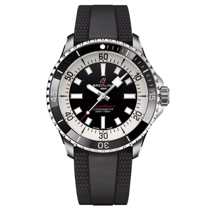 Breitling Superocean a17375211b1s1 42mm men's watch. The watch features a brushed and polished stainless steel case with a polished black ceramic bezel adorned with a diving scale and luminous starting dot, complementing the black main dial and silver dial flange. It showcases polished hands with luminous fill, applied polished hour markers with luminous fill, and a printed minutes/seconds track. Powering this timepiece is the Breitling calibre 17, COSC Certified, running at 28,000 vph (4Hz) with 26 jewels and an approximate power reserve of 38 hours.