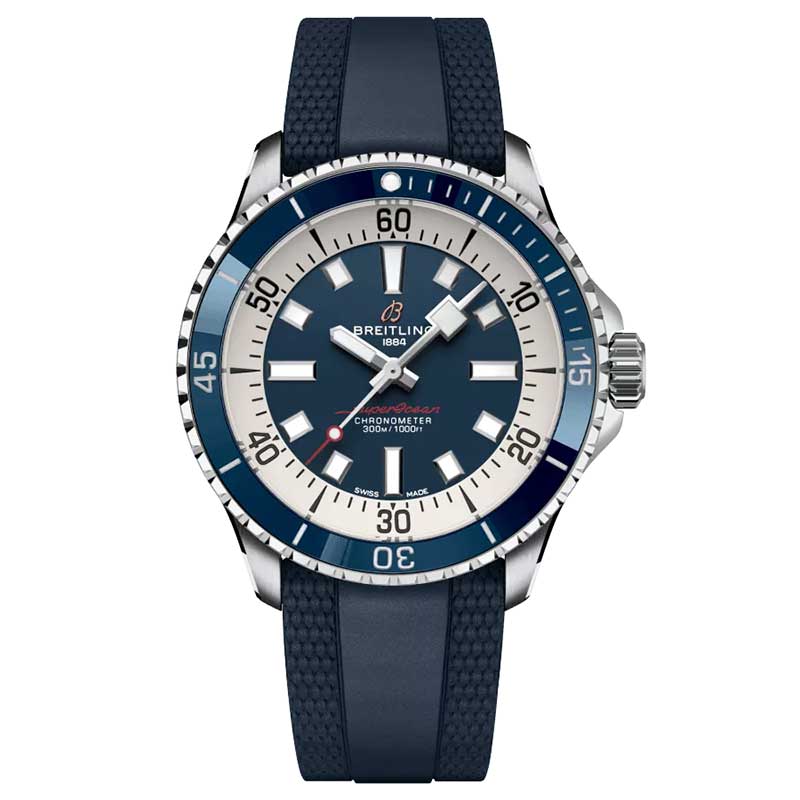 Breitling Superocean a17375e71c1s1 42mm men's watch. The timepiece boasts a brushed and polished stainless steel case, paired with a polished blue ceramic bezel featuring a diving scale and luminous starting dot. The watch showcases a captivating blue main dial with a silver dial flange, polished hands with luminous fill, applied polished hour markers with luminous fill, and a printed minutes/seconds track. Driving this exceptional watch is the Breitling calibre 17, COSC Certified, beating at 28,000 vph (4Hz) with 26 jewels and providing an approximate power reserve of 38 hours.