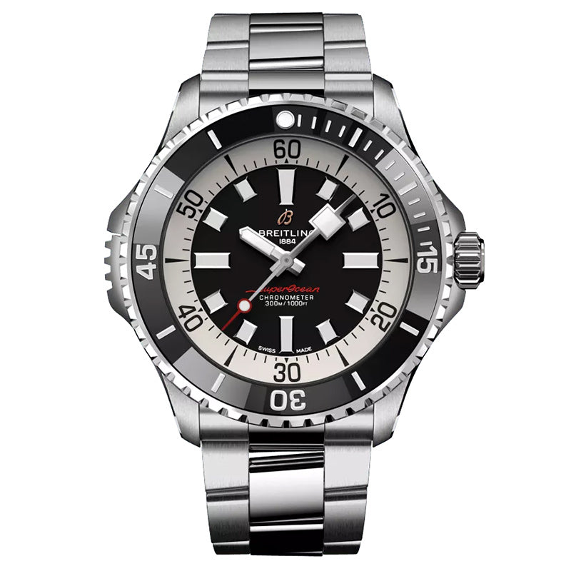 Breitling a17378211b1a1 Superocean 46mm Mens Watch. The Brushed & polished stainless steel case & bracelet watch exudes a sophisticated charm with its polished black ceramic bezel adorned with a diving scale and luminous starting dot. The sleek black main dial is complemented by a silver dial flange, creating a striking contrast. Polished hands with luminous fill and applied hour markers with the same feature ensure optimal visibility in any lighting, while the printed minutes/seconds track adds a practical touch. Featuring the esteemed Breitling calibre 17, COSC Certified, operating at 28,000 vph (4Hz) with 26 jewels and an approximate power reserve of 38 hours, this timepiece blends style and precision seamlessly for a refined and reliable watch option.