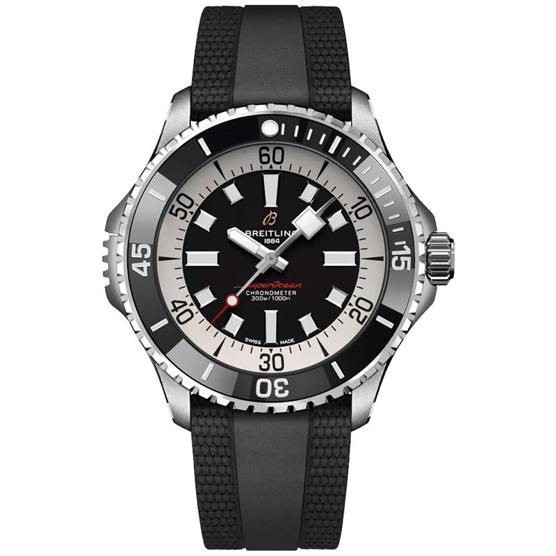 Breitling a17378211b1s1 Superocean 46mm Mens Watch. The brushed and polished stainless steel case watch features a polished black ceramic bezel with a diving scale and luminous starting dot, accompanied by a sleek black main dial and a silver dial flange. Its polished hands with luminous fill and applied hour markers with the same feature ensure readability in various lighting conditions, while a printed minutes/seconds track adds practicality. Equipped with the esteemed Breitling calibre 17, this COSC Certified timepiece operates at 28,000 vph (4Hz) with 26 jewels and an approximate power reserve of 38 hours, making it a reliable and stylish choice for everyday wear.