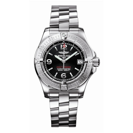 Breitling Aeromarine Colt Oceane Steel Black Ladies Watch A7738011-B7-617. Breitling Aeromarine Colt Oceane Steel Black Ladies Watch A7738011 Stainless steel case with a stainless steel bracelet. Unidirectional rotating. Black dial with luminous hands and numbers and stick hour markers. Quartz movement. Scratch resistant sapphire crystal. Case diameter: 33.2mm. Case thickness: 11.6mm. Deployment clasp. Water resistant at 500 meters / 1650 feet. AdditionalInfo: date displays at 3 o'clock position; eol indicator.