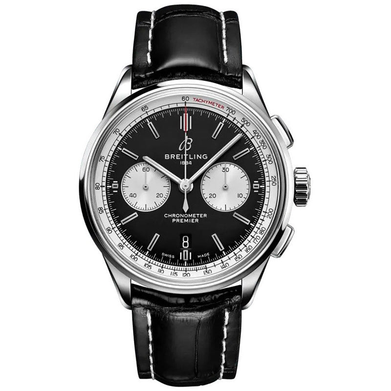Breitling ab0118371b1p1 Men's Premier Watch. The watch is encased in high-quality stainless steel with a brushed and polished finish for a sophisticated appearance. Its black dial features elegant silver sub-dials and is accented by a silver dial flange with a tachymeter scale, while applied index hour markers and a fine printed minute/seconds & fractions of a seconds track ensure precise timekeeping. The watch also includes a small seconds sub-dial at 9 o'clock and a useful date window at 6 o'clock for added functionality. Equipped with a column wheel mechanism, the chronograph functions consist of a central seconds counter hand and a 30-minute counter sub-dial at 3 o'clock. The watch is powered by the reliable Breitling in-house caliber B01 movement, which beats at 28,800 vph, contains 41 jewels, and provides an approximate power reserve of 70 hours, making it a blend of style and performance.