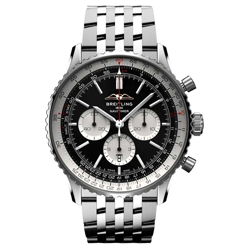 Breitling Navitimer B01 Chronograph Automatic Chronometer Mens Watch ab0137211b1a1. The watch boasts a combination of brushed and polished stainless steel case, along with a stainless steel bi-directional rotating bezel featuring a slide-rule, enabling pilots to conduct essential flight calculations effortlessly. The black dial, complemented by silver sub-dials and a silver dial flange, showcases the prominent AOPA wings logo at 12 o'clock. Polished hour and minute hands with luminous fill, accompanied by black sub-dial hands, offer optimal visibility in varying light conditions. Applied polished index hour markers with luminous tips enhance readability, while a finely printed minutes/seconds and 1/4 seconds fractions track ensures precision timekeeping. Adding to its functionality, the watch includes a small seconds sub-dial at 9 o'clock and a convenient date window positioned at 6 o'clock.