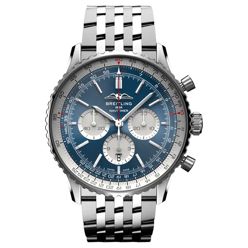 Breitling Navitimer B01 Chronograph Automatic Chronometer Mens Watch ab0137211c1a1. The watch boasts a combination of brushed and polished stainless steel case, along with a stainless steel bi-directional rotating bezel featuring a slide-rule, enabling pilots to conduct essential flight calculations effortlessly. The blue dial, complemented by silver sub-dials and a silver dial flange, showcases the prominent AOPA wings logo at 12 o'clock. Polished hour and minute hands with luminous fill, accompanied by black sub-dial hands, offer optimal visibility in varying light conditions. Applied polished index hour markers with luminous tips enhance readability, while a finely printed minutes/seconds and 1/4 seconds fractions track ensures precision timekeeping. Adding to its functionality, the watch includes a small seconds sub-dial at 9 o'clock and a convenient date window positioned at 6 o'clock.