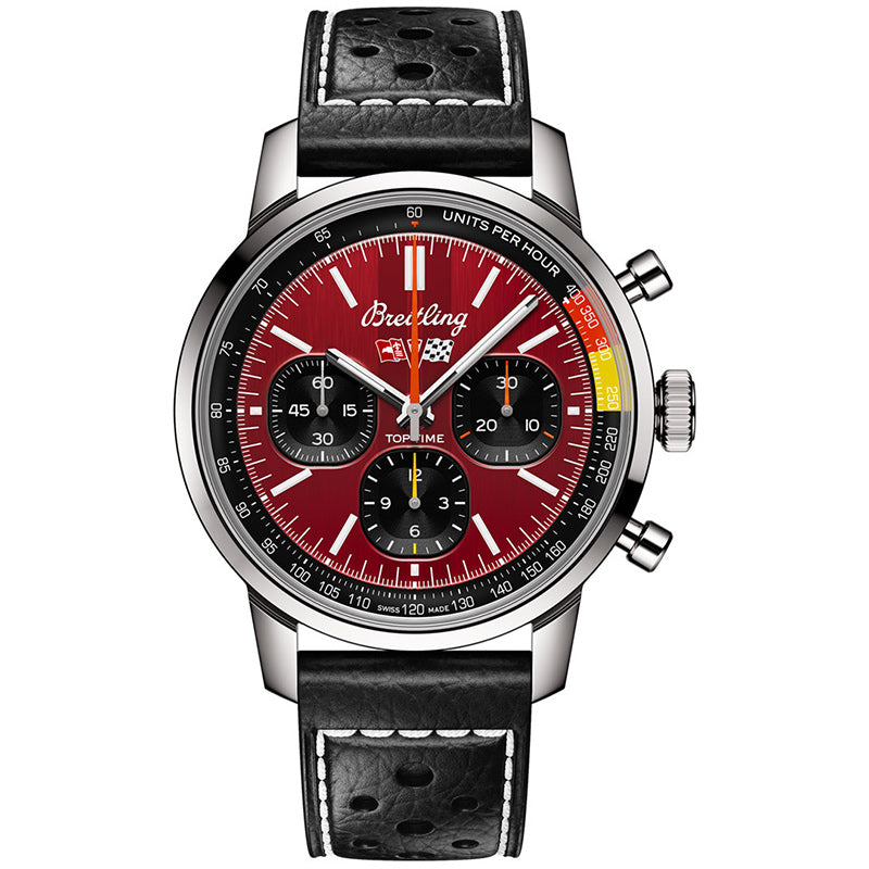 Breitling ab01761a1k1x1 Top Time 41mm Men's Watch. The Breitling TOP TIME B01 Chevrolet Corvette watch showcases a sleek stainless steel case paired with a black perforated leather racing strap. Its striking red dial features black “squircle” subdials and index hour markers, along with a tachymeter scale on the black dial flange, adding to its sporty aesthetic. A fine printed minute/seconds & fractions of a second track enhances its timekeeping precision, while a small seconds sub-dial is positioned at 9 o'clock. The chronograph functions include a large central orange seconds hand counter capable of timing up to 1/4th of a second, a 30-minute sub-dial counter at 3 o'clock, and a 12-hour counter sub-dial at 6 o'clock, providing comprehensive timing capabilities. Powering this watch is the Breitling Caliber 01, operating at 28,800 vph, composed of 40 jewels, and offering an approximate power reserve of 70 hours, making it a reliable and stylish companion for automotive enthusiasts.