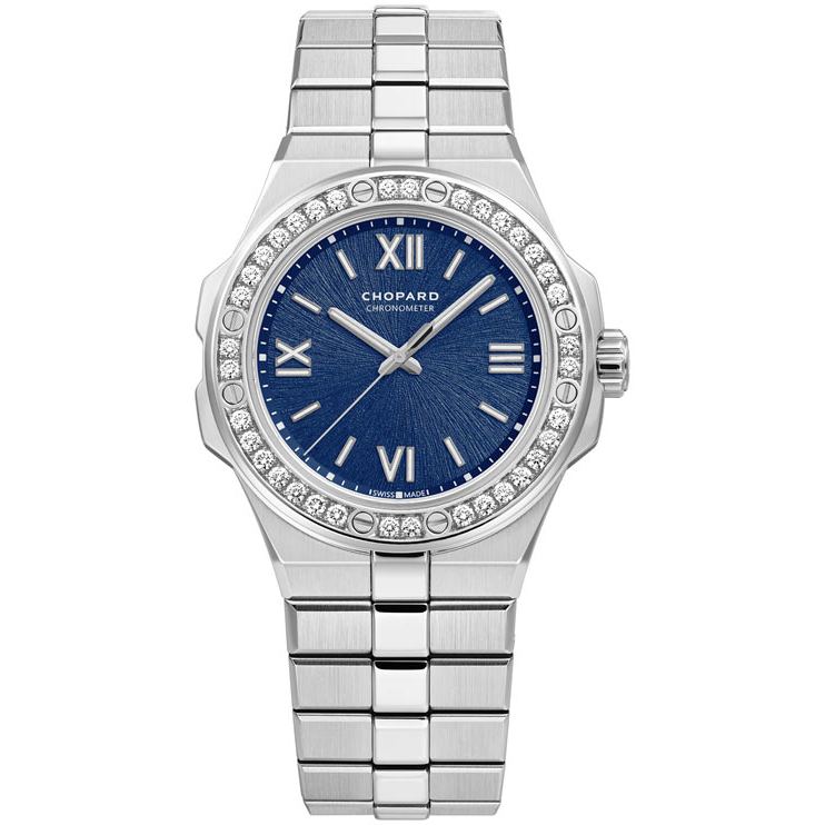 Chopard Alpine Eagle Automatic Diamond Blue Dial Ladies Watch 298601-3004. Silver-tone stainless steel case and bracelet. Fixed silver-tone bezel with diamond set. Blue dial with silver-tone hands and Roman numeral, index hour markers. Chopard Calibre 09.01-C Automatic movement, containing 27 Jewels, bitting at 25200 vph, and has a power reserve of approximately 42 hours. Scratch resistant sapphire crystal. Screw down crown. Transparent case back. Round case shape, case size: 36 mm, case thickness: 8.45 mm. Hidden folding clasp.