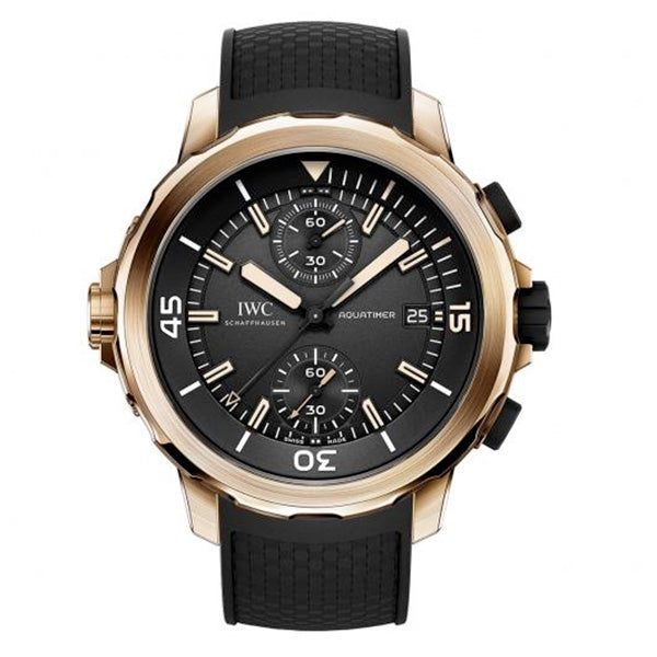 IWC Aquatimer Chronograph Expedition Charles Darwin Men's Watch IW379503. Bronze case with a black rubber strap. Rotating inner bezel. Black dial with index hour markers. Minute markers around the outer rim. Chronograph - two sub-dials displaying: 60 second and 60 minute. Automatic movement with a 68-hour power reserve. Scratch resistant sapphire crystal. Screw down crown. Solid case back. Case diameter: 44 mm. Case thickness: 17 mm. Strap width: 22 mm. Round case shape. Water resistant at 300 meters / 1000 feet. Functions: chronograph, date, hour, minute, second.