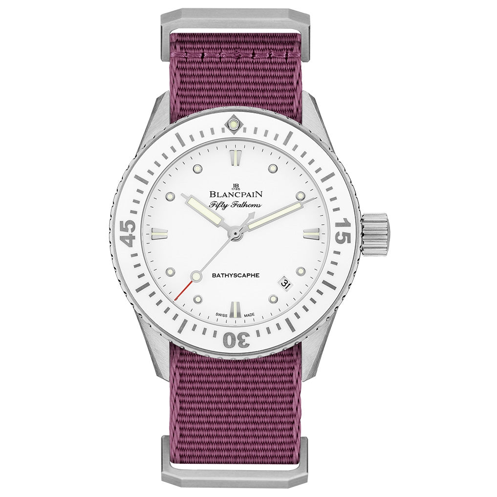 Blancpain Fifty Fathoms Bathyscaphe Automatic White Dial White Fabric Ladies Watch 5100-1127-NAVA Stainless steel case with a purple violet fabric strap. Uni-directional rotating stainless steel bezel with a white ceramic top ring. White dial with luminous hands and index hour markers. Minute markers around the outer rim. Automatic movement with a 100 hour power reserve. Scratch resistant sapphire crystal. Screw down crown. Transparent case back. Case diameter: 38 mm. Case thickness: 10.77 mm. Round case shape. Tang clasp. Water resistant at 300 meters / 1000 feet. Functions: date, hour, minute, second.