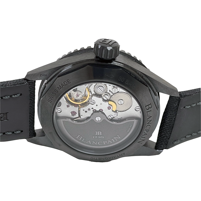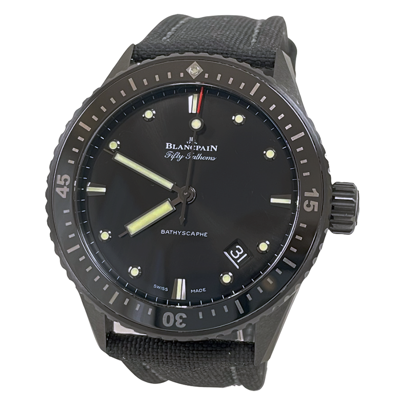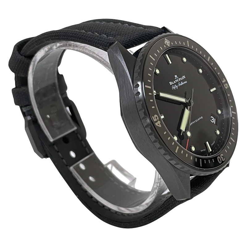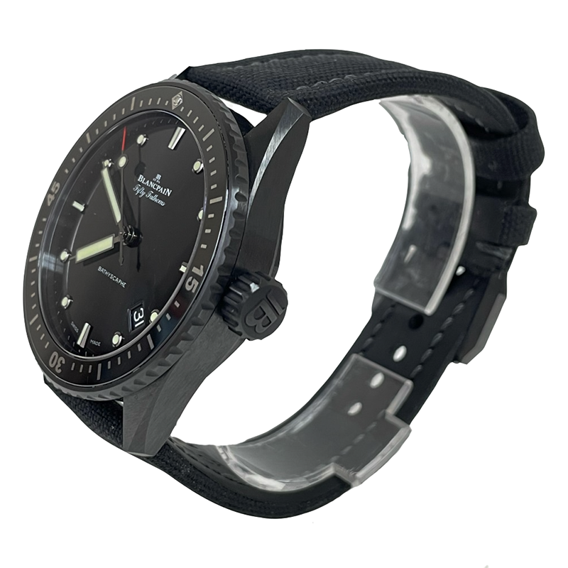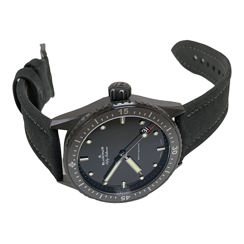 Black ceramic case with a black fabric strap. Uni-directional rotating black ceramic bezel. Black dial with luminous hands and dot hour markers. Minute markers around the outer rim. Dial Type: Analog. Luminescent hands and markers. Date display between the 4 and 5 o'clock positions. Automatic movement with a 120 hour power reserve. Scratch resistant sapphire crystal. Screw down crown. Transparent case back. Case diameter: 43 mm. Case thickness: 13.40 mm. Round case shape. Tang clasp. Water resistant at 300 meters / 1000 feet. Functions: date, hour, minute, second. Luxury watch style. Watch label: Swiss Made. Blancpain Fifty Fathoms Bathyscaphe Automatic Black Dial Black Fabric Mens Watch 5000-0130-B52A.