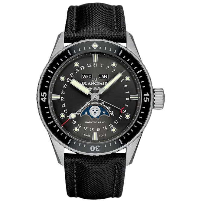 Blancpain Fifty Fathoms Complete Calendar Automatic Mens Watch 5054-1110-B52A. Brushed stainless steel case with a black nato bracelet. Uni-directional rotating bezel. Meteor grey dial. Minute markers around the outer rim. Calendar features with calendar corrector buttons hidden from sight on the case back beneath the lugs. The corrector buttons can be activated without tools. Day & Month windows displayed beneath the 12 o'clock position. Date indicated by the short red-tipped hand which points to the current date at the center of dial. Moonphase aperture located at the bottom of the dial. Blancpain Calibre F385 automatic movement with about 50 hours of power reserve. Scratch resistant sapphire crystal. Case size: 43 mm. Case thickness: 14.85 mm. Round case shape. Band width: 23 mm. Water resistant at 30 meters / 100 feet.