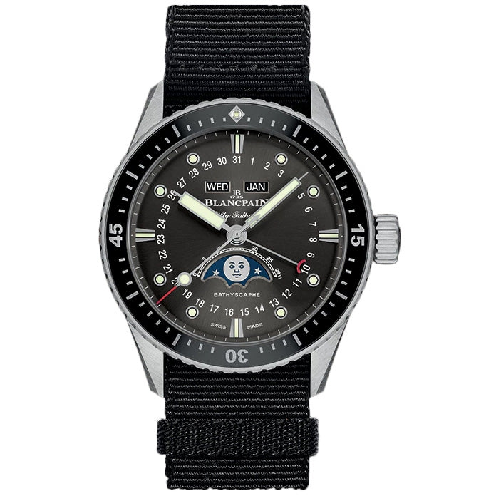 Blancpain Fifty Fathoms Complete Calendar Automatic Mens Watch 5054-1110-NABA. Brushed stainless steel case with a black nylon bracelet. Uni-directional rotating bezel. Meteor grey dial. Minute markers around the outer rim. Calendar features with calendar corrector buttons hidden from sight on the case back beneath the lugs. The corrector buttons can be activated without tools. Day & Month windows displayed beneath the 12 o'clock position. Date indicated by the short red-tipped hand which points to the current date at the center of dial. Moonphase aperture located at the bottom of the dial. Blancpain Calibre F385 automatic movement with about 50 hours of power reserve. Scratch resistant sapphire crystal. Case size: 43 mm. Case thickness: 14.85 mm. Round case shape. Band width: 23 mm. Water resistant at 30 meters / 100 feet.