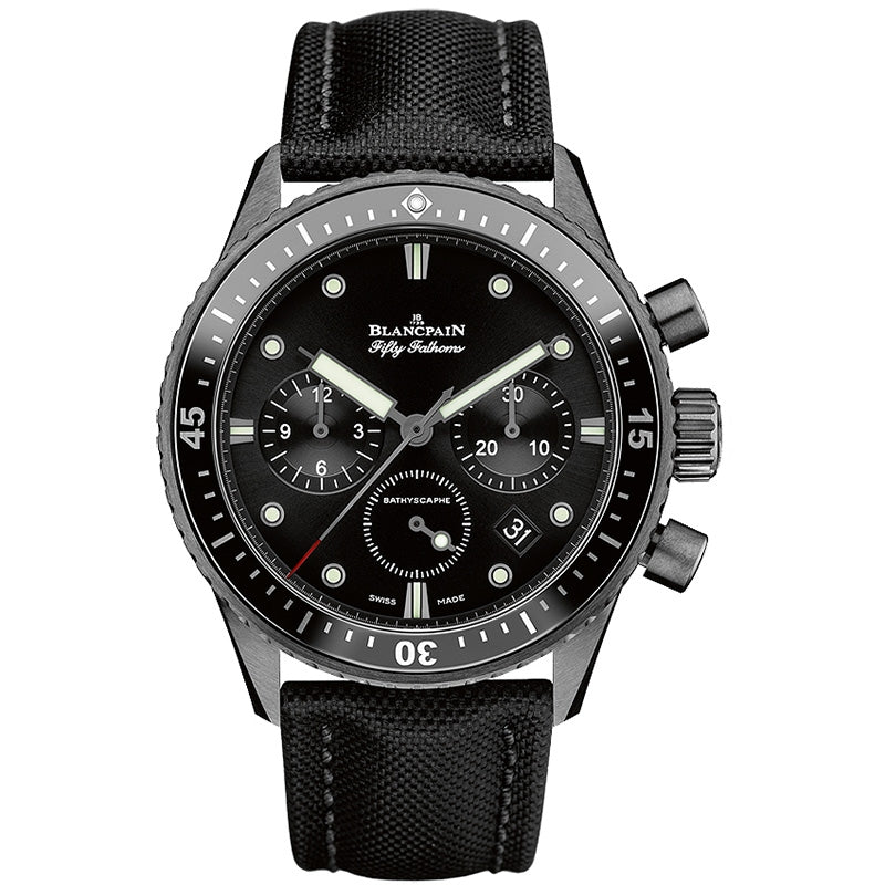 Blancpain Fifty Fathoms Bathyscaphe Chronograph Mens Watch 5200-0130-B52A. Black ceramic case with a black fabric bracelet. Uni-directional rotating black ceramic with black bezel. Black dial with luminous hands and dot hour markers. Minute markers around the outer rim. Chronograph - sub-dials displaying: three - 60 second, 30 minute and 12 hour. Blancpain Calibre F385 automatic movement with about 50 hours of power reserve. Scratch resistant sapphire crystal. Screw down crown. Skeleton case back. Case size: 43 mm. Case thickness: 15.25 mm. Round case shape. Tang clasp. Water resistant at 300 meters / 1000 feet.