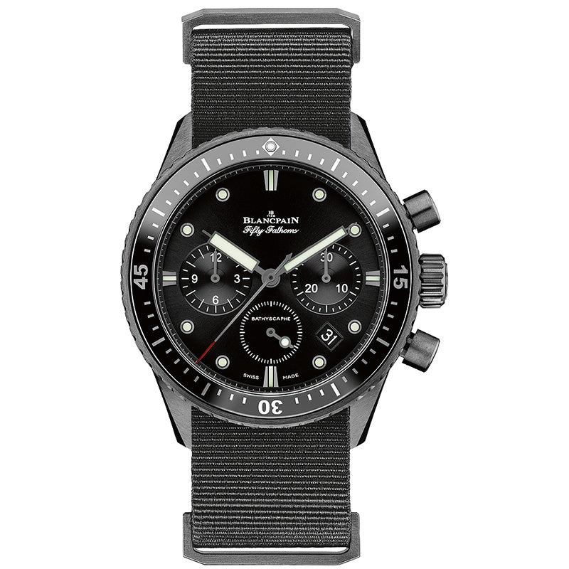 Blancpain Fifty Fathoms Bathyscaphe Chronograph Mens Watch 5200-0130-NABA. Black ceramic case with a black nylon flyback bracelet. Uni-directional rotating black ceramic with black bezel. Black dial with luminous hands and dot hour markers. Minute markers around the outer rim. Chronograph - sub-dials displaying: three - 60 second, 30 minute and 12 hour. Blancpain Calibre F385 automatic movement with about 50 hours of power reserve. Scratch resistant sapphire crystal. Screw down crown. Skeleton case back. Case size: 43 mm. Case thickness: 15.25 mm. Round case shape. Tang clasp. Water resistant at 300 meters / 1000 feet.
