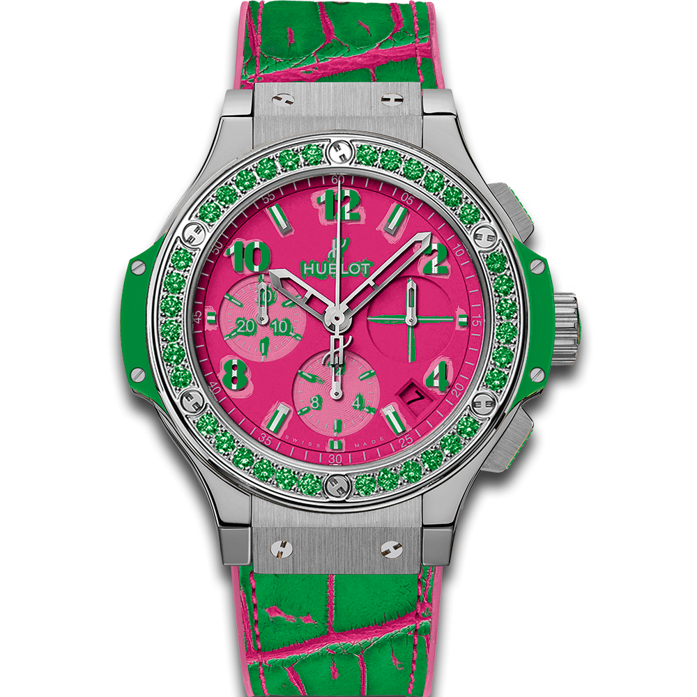 Hublot Big Bang Pop Art Mat Dark Rose Dial Chronograph Limited Edition Ladies Watch 341.SG.7379.LR.1222.POP15. Polished and satin-finished stainless steel case with a pink rubber and mixed colored alligator strap. Fixed polished stainless steel set with 36 tsavorites bezel. Mat dark rose dial with rhodium-plated hands and Arabic numeral/ index hour markers. Minute markers around the outer rim. Chronograph - sub-dials displaying: three - 60 second, 30 minute and 12-hour. Automatic movement. Hub4300 engine. Scratch resistant sapphire crystal. Case diameter: 41 mm. Round case shape. Deployment buckle clasp. Functions: chronograph, date, hour, minute, second. Additional Info: limited edition- - 200 pieces. Item Variations: 341 SG 7379 LR 1222 POP15, 341-SG-7379-LR-1222-POP15, 341SG7379LR1222POP15.