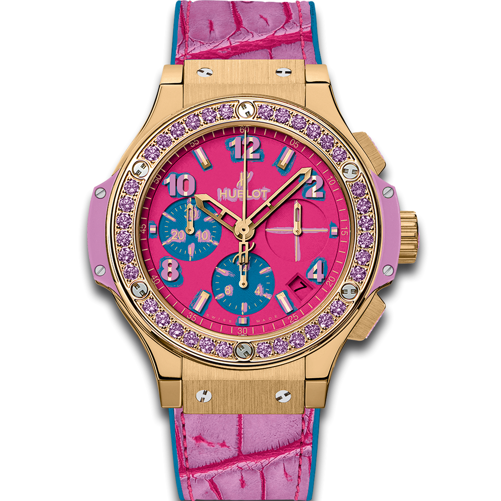 Hublot Big Bang Pop Art Mat Dark Rose Dial 18k Yellow Gold Limited Edition Ladies Watch 341.VV.7389.LR.1205.POP15. Polished 18 carat yellow gold case with a blue rubber and mixed colored alligator strap. Fixed polished 18 yellow gold set with 36 amethysts bezel. Mat dark rose dial with gold plated hands and Arabic numeral/ index hour markers. Minute markers around the outer rim. Chronograph - sub-dials displaying: three - 60 second, 30 minute and 12-hour. Automatic movement. Hub4300 engine. Scratch resistant sapphire crystal. Case diameter: 41 mm. Round case shape. Deployment buckle clasp. Functions: chronograph, date, hour, minute, second. Additional Info: limited edition - 20 pieces. Item Variations: 341 VV 7389 LR 1205 POP15, 341-VV-7389-LR-1205-POP15, 341VV7389LR1205POP15.