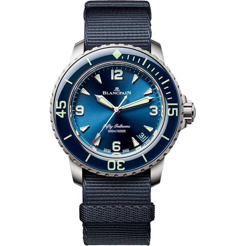 Blancpain Fifty Fathoms Automatic Mens Watch 5010-12B40-NAOA. Crafted for endurance and elegance, this Blancpain timepiece features a brushed titanium case and matching crown, combining lightweight strength with a refined finish. The uni-directional rotating bezel, also in brushed titanium, is capped with sapphire crystal and detailed with a luminous scale, ensuring visibility and durability under pressure. Beneath the domed sapphire crystal, the blue sunray dial shimmers with sophistication. Polished, applied hour markers—a mix of numerals and indices—alongside luminous hands and a prominent central seconds hand, ensure optimal readability, even in low light. A discreet date window at 4:30 adds functionality without compromising design. Powering the watch is the exceptional Blancpain Calibre 1315, a self-winding movement beating at 4Hz (28,800 vph), featuring 35 jewels and an impressive 120-hour (5-day) power reserve, making it as reliable as it is refined.