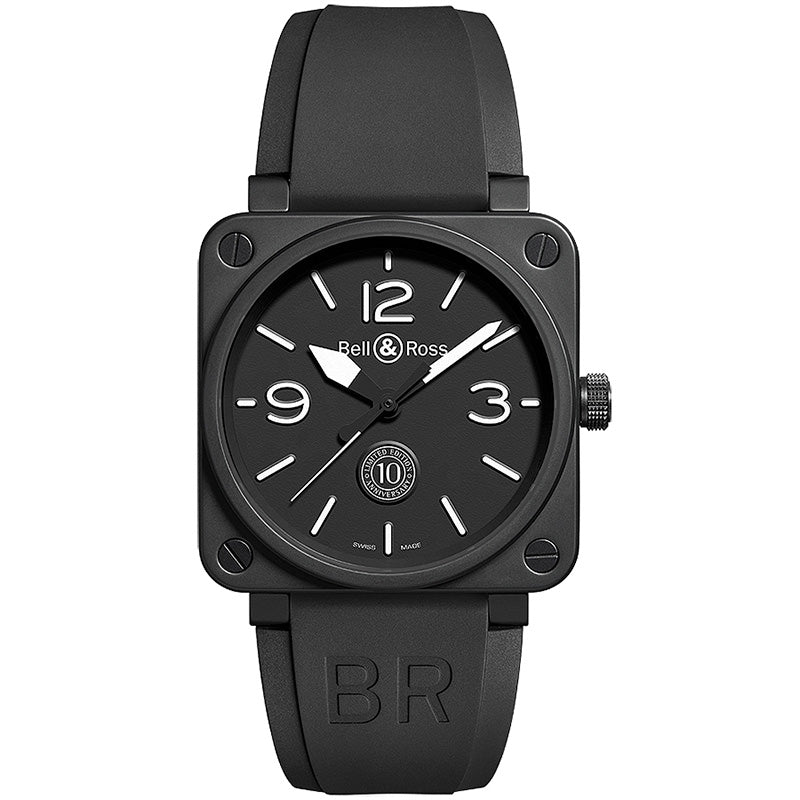 Bell and Ross Aviation Black Dial Limited Edition Automatic Mens Watch BR0192-10TH-CE. Black ceramic case with a black rubber strap. Fixed bezel. Black dial with black hands and index and Arabic numeral hour markers. Bell and Ross Calibre BR-CAL.302 automatic movement with about 42 hours of power reserve. Scratch resistant sapphire crystal. Solid case back. Case size: 46 mm x 46 mm. Square case shape. Tang clasp. Water resistant at 100 meters / 330 feet. Functions: hour, minute, second. Additional Info: 10-year anniversary limited edition of 500 pieces.
