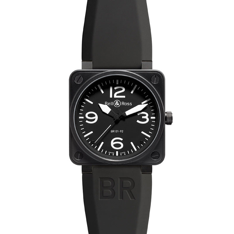 Bell and Ross Aviation Carbon Fiber Black Dial 46 MM Automatic Mens Watch BR-01-92-CARBON-FIBER. Black carbon fiber IP steel case with a black rubber strap. Fixed bezel. Black dial with luminous hands and index hour markers. Arabic numerals mark the 3, 6, 9, and 12 o'clock positions. minute markers around the outer rim. Automatic movement. Scratch resistant sapphire crystal. Solid case back. Case diameter: 46 mm x 46 mm. Square case shape. Tang clasp. Water resistant at 100 meters/ 330 feet. Functions: hours, minutes, seconds. Additional Info: limited edition, numbered xxx of 500. Luxury watch style. Watch label: Swiss Made. Item Variations: BR0192 CA FIBER, BR0192.CA.FIBER, BR0192CAFIBER.