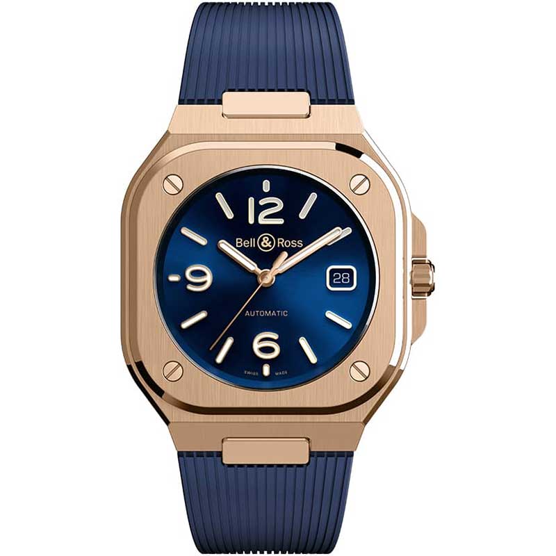 Bell & Ross BR05A-BLU-PG/SRB Men's Watch. 40mm 18kt rose gold case, sapphire back, sapphire crystal with anti-reflective coating, blue sunray dial with rose gold gilded applique numerals and indices filled with super-luminova, calibre BR-CAL.321 automatic movement with hours, minutes, seconds and date, blue rubber bracelet, folding buckle.