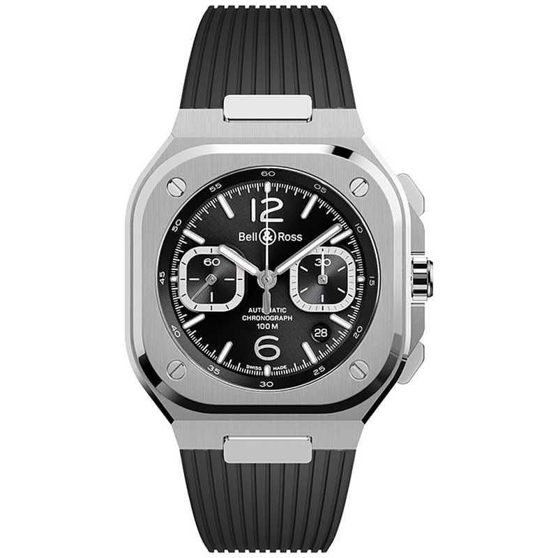 Bell & Ross BR05C-BLC-ST/SRB Men's Watch. Silver-tone steel case with a black rubber strap. Fixed silver-tone steel bezel. Black dial with silver-tone hands and Arabic numeral and indicies hour markers. Dial Type: Analog. Luminescent hands and markers. Date display between 4 and 5 o'clock position. Chronograph - two sub-dials displaying: 60 second and 30 minute. Bell and Ross Calibre BR-CAL.326 Automatic movement, based upon Sellita SW510, containing 26 Jewels, bitting at 28800 vph, and has a power reserve of approximately 60 hours. Scratch resistant sapphire crystal.
