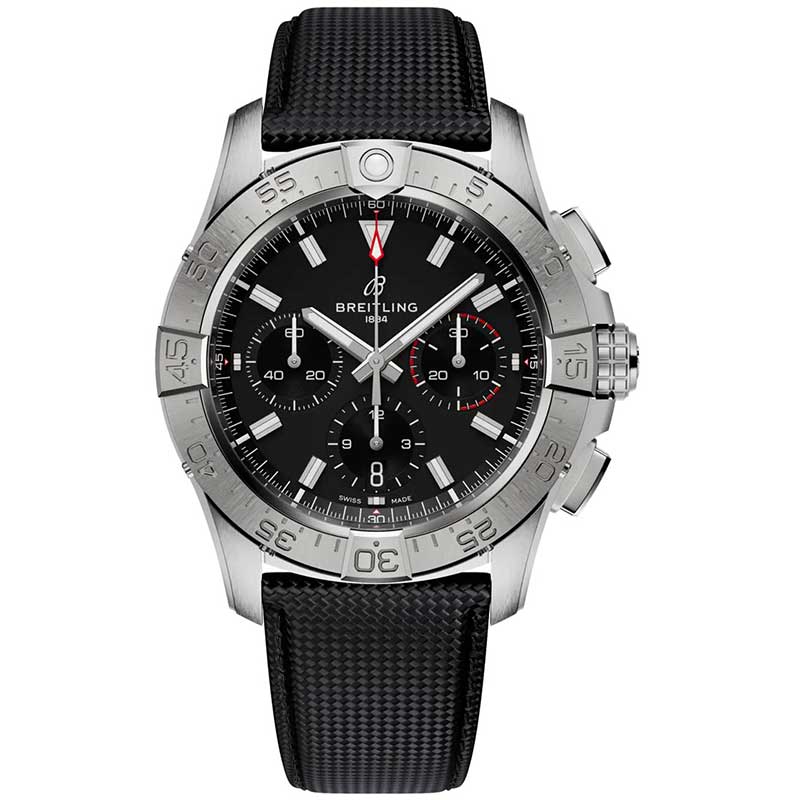 Breitling AB0146101B1X1 Avenger B01 Chronograph 42 Men's Watch. This watch features a brushed stainless steel case with a uni-directional rotating bezel, finished with brushed and polished surfaces and raised 15-minute tabs. It has a black dial with applied luminous markers and luminous hands, framed by a black dial flange with minute and second markers. The seconds hand is positioned in a sub-dial at 9 o'clock, and the date window sits at 6 o'clock. Powered by the Breitling calibre B01, this movement beats at 4Hz (28,800 vph), has 45 jewels, and a 70-hour power reserve. The chronograph functions include a column-wheel mechanism with a vertical clutch, a central seconds counter hand, a 30-minute counter at 3 o'clock, and a 12-hour counter at 6 o'clock.