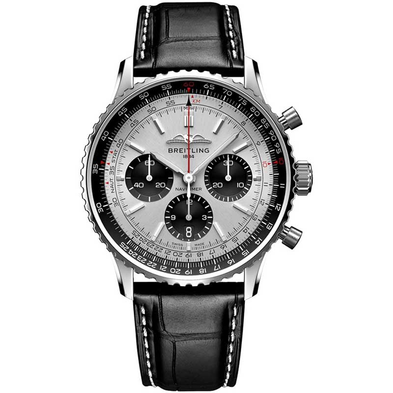 Breitling ab0138241g1p1 Navitimer B01 Chronograph 43mm Men's Watch. This watch features a brushed and polished stainless steel case with a bi-directional rotating bezel and slide-rule for flight calculations. It has a silver dial, black sub-dials, and the AOPA wings logo at the 12 o'clock position. The polished hour and minute hands include luminous fill, while applied polished index markers have luminous tips. Additional details include a small seconds sub-dial at 9 o'clock, a date window at 6 o'clock, and chronograph functions powered by the Breitling in-house caliber B01 with a column wheel mechanism. This movement operates at 28,800 vph, contains 47 jewels, and offers a 70-hour power reserve.