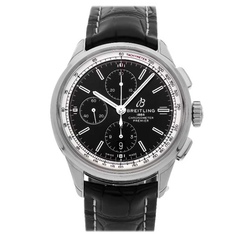 Breitling a13315351b1p2 Men's Premier Watch. The watch features a stainless steel case with a brushed and polished finish, showcasing a striking black dial and a silver dial flange that includes a tachymeter scale. It is adorned with applied index hour markers and has finely printed tracks for minutes, seconds, and fractions of a second. Additionally, there's a small seconds sub-dial located at the 9 o'clock position and a date window at 6 o'clock. Its chronograph functions include a central seconds counter hand, a 30-minute counter sub-dial at 12 o'clock, and a 12-hour counter sub-dial at 6 o'clock. Powered by the Breitling 13 movement, it beats at 28,800 vibrations per hour (vph), contains 25 jewels, and boasts an approximate power reserve of 48 hours.
