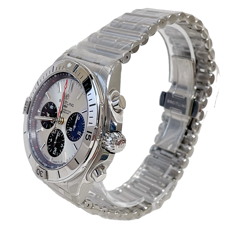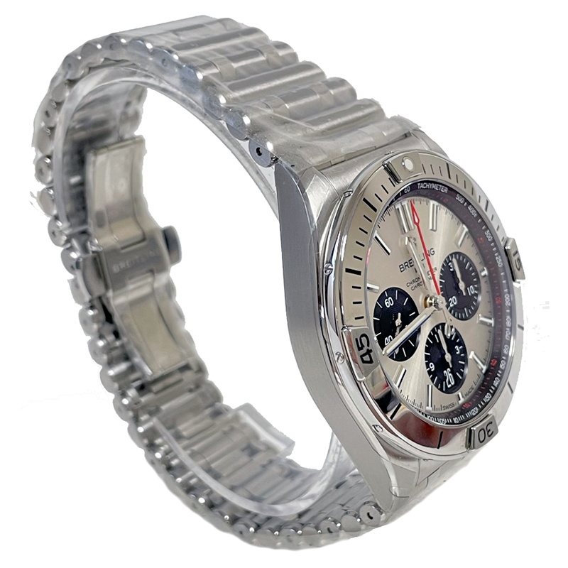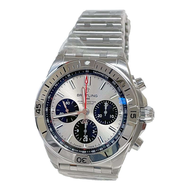 Breitling Chronomat B01 42 Chronograph Automatic Silver Dial Men's Watch AB0134101G1A1. Stainless steel case with a 1stainless steel bracelet. Uni-directional rotating stainless steel bezel. Silver dial with luminous silver-tone hands and index hour markers. Minute markers. 1/100th second markers. Tachymeter markings around the outer rim. Luminescent hands and markers. Date display at the 6 o'clock position. Chronograph - three black sub-dials displaying: 60 second, 30 minute and 12 hour. Breitling calibre 01 automatic movement, containing 47 Jewels, composed of 346 parts, bitting at 28800 vph, and has a power reserve of approximately 70 hours. Scratch resistant sapphire crystal. Screw locked crown. Transparent case back. Round case shape. Case size: 42 mm. Case thickness: 15.1 mm. Band width: 22 mm / 20 mm. Fold over clasp with a push button release. Water resistant at 200 meters / 660 feet.