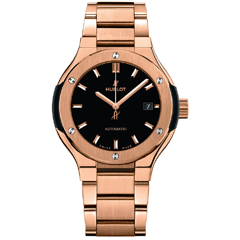 Hublot Classic Fusion Black Dial Automatic Ladies 18 Carat Rose Gold Watch 585.OX.1180.OX. 18kt rose gold case with a 18 carat rose gold bracelet. Fixed bezel. Black dial with rose gold-tone hands and index hour markers. Automatic movement. Caliber hub1120 engine. Scratch resistant sapphire crystal. Pull / push crown. Solid case back. Case diameter: 33 mm. Round case shape. Water resistant at 50 meters / 165 feet. Functions: date, hour, minute, second. Luxury watch.