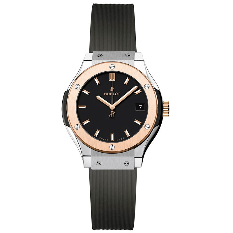 Hublot 581.NO.1181.RX Classic Fusion Quartz 33mm Ladies Watch. Polished titanium case with brushed finished top & bottom center links between the lugs. 18kt rose gold bezel with a brushed finished top & polished finished beveled edge, secured with 6 polished "H" style titanium screws. Polished 18kt rose gold crown engraved with the Hublot logo. Black composite resin "bezel lug" sandwiched between the bezel & case. Flat matte black dial. Applied index hour markers. Polished gold plated hands. Date window located at the 3 o'clock position. Hublot Quartz/Battery powered caliber HUB2912, composed out of 38 parts.