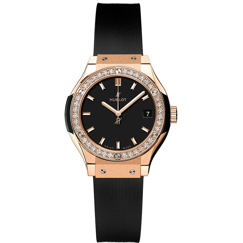 Hublot 581.OX.1181.RX.1104 Classic Fusion Quartz 33mm Ladies Watch. Polished 18kt rose gold case with brushed finished top & bottom center links between the lugs. 18kt rose gold bezel set with single row of 36 brilliant cut diamonds weighing a total of approximately 0.75 carats. Bezel secured with 6 polished "H" style titanium screws. Polished 18kt rose gold crown engraved with the Hublot logo. Black composite resin "bezel lug" sandwiched between the bezel & case. Flat matte black dial. Applied gold plated index hour markers.