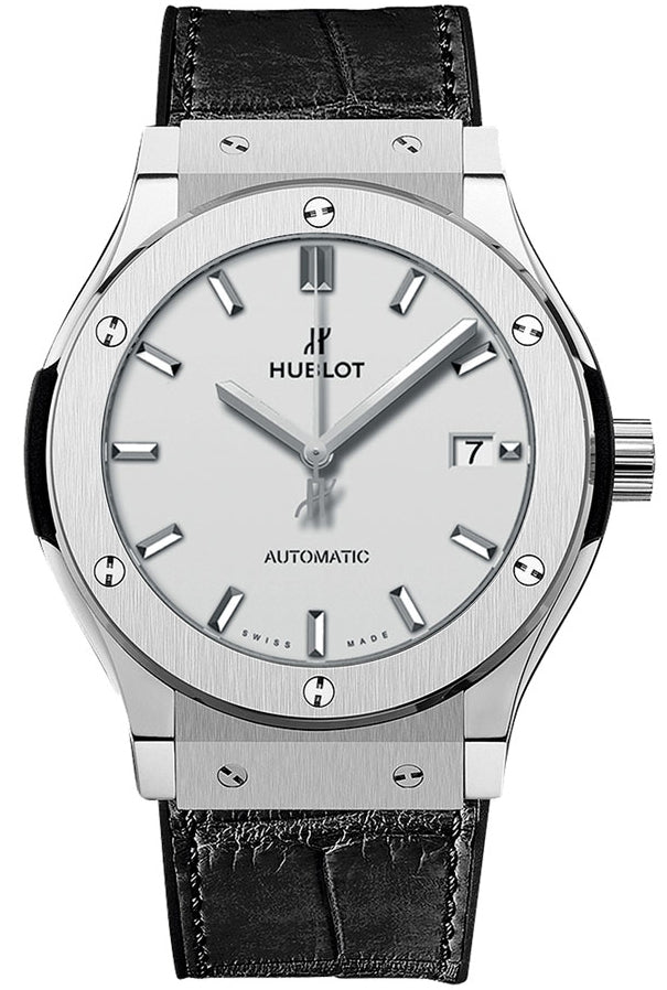 Hublot Classic Fusion Silver Opaline Dial Automatic Men's Titanium Watch 565.NX.2611.LR. Titanium case with a alligator outer / rubber inner strap. Fixed bezel. Silver opaline dial with silver-tone hands and index hour markers. Automatic movement. Caliber hub1110 engine. Scratch resistant sapphire crystal. Skeleton transparent exhibition see through case back. Case diameter: 38 mm. Round case shape. Fold over with safety clasp. Water resistant at 50 meters / 165 feet. Functions: date, hour, minute, second. Luxury watch.