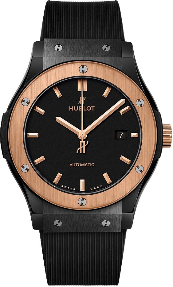 Hublot 565.CO.1181.RX Classic Fusion Automatic 38mm Mens Watch. Polished black ceramic case with brushed finished top & bottom center links between the lugs. Solid 18kt rose gold bezel, with a brushed finished top & polished finished beveled edge, secured with 6 polished "H" style titanium screws. Solid polished 18kt rose gold crown engraved with the Hublot logo. Black composite resin "bezel lug" sandwiched between the bezel & case. Matte black dial. Gold plated index hour markers. Polished gold plated hands. Date window located at the 3 o'clock position. Hublot Caliber HUB1112, beats at 28,800 vph, composed out of 63 parts, contains 21 Jewels & has an approximate power reserve of 42 hours.