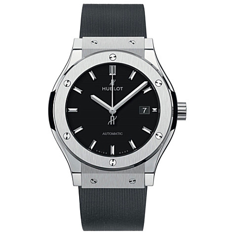 Hublot Classic Fusion Mat Black Dial Titanium Mens Watch 565.NX.1171.RX. Titanium case with a black rubber bracelet. Fixed titanium bezel. Mat black dial with silver-tone hands and index hour markers. Automatic movement. Scratch resistant sapphire crystal. Skeleton transparent exhibition see through case back. Case diameter: 45mm. Tonneau case shape. Fold over with safety clasp. Water resistant at 50 meters / 165 feet. Functions: date, hour, minute, second.