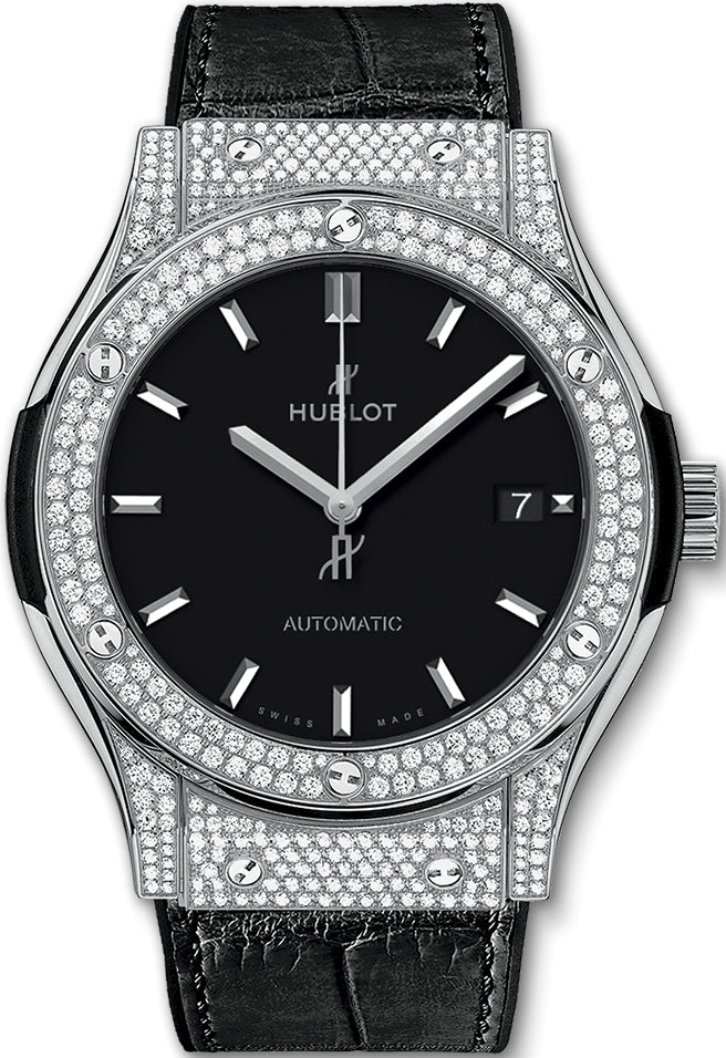 Hublot Classic Fusion Mat Black Dial Automatic Mens Titanium Pave Watch 511.NX.1171.LR.1704. Titanium case with a alligator outer / rubber inner strap. Fixed bezel. Mat black dial with rhodium- plated hands and index hour markers. Automatic movement. Caliber hub1112 engine. Scratch resistant sapphire crystal. Skeleton transparent exhibition see through case back. Case diameter: 45 mm. Round case shape. Deployant buckle clasp. Water resistant at 50 meters / 165 feet. Functions: date, hour, minute, second. Additional Info: bezel set with 126 diamonds for 1.41cts, case set with 218 diamonds for 1.41cts. Luxury watch.